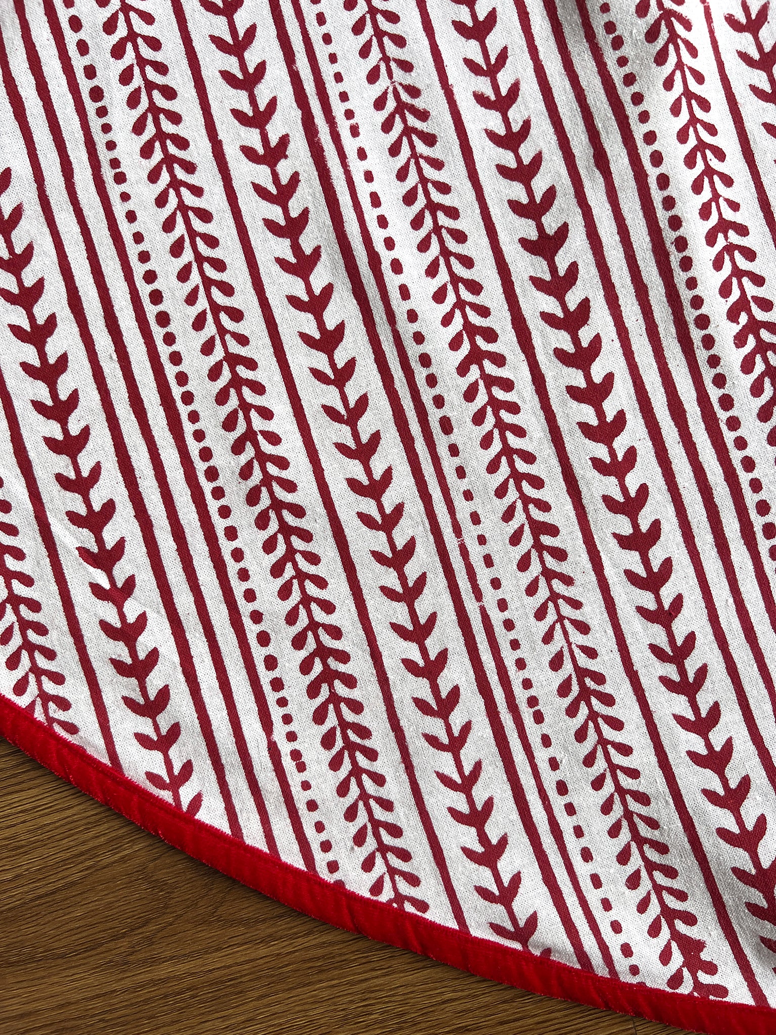 Edged with a bright red velvet trim and coordinated ties to secure the skirt, each one is made of a single cotton layer of a classic block print pattern. The single layer allows it to drape organically or be styled to your choice.