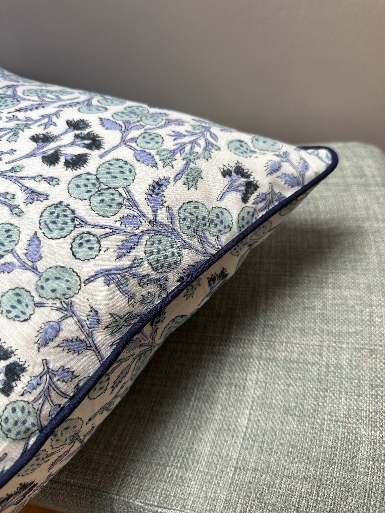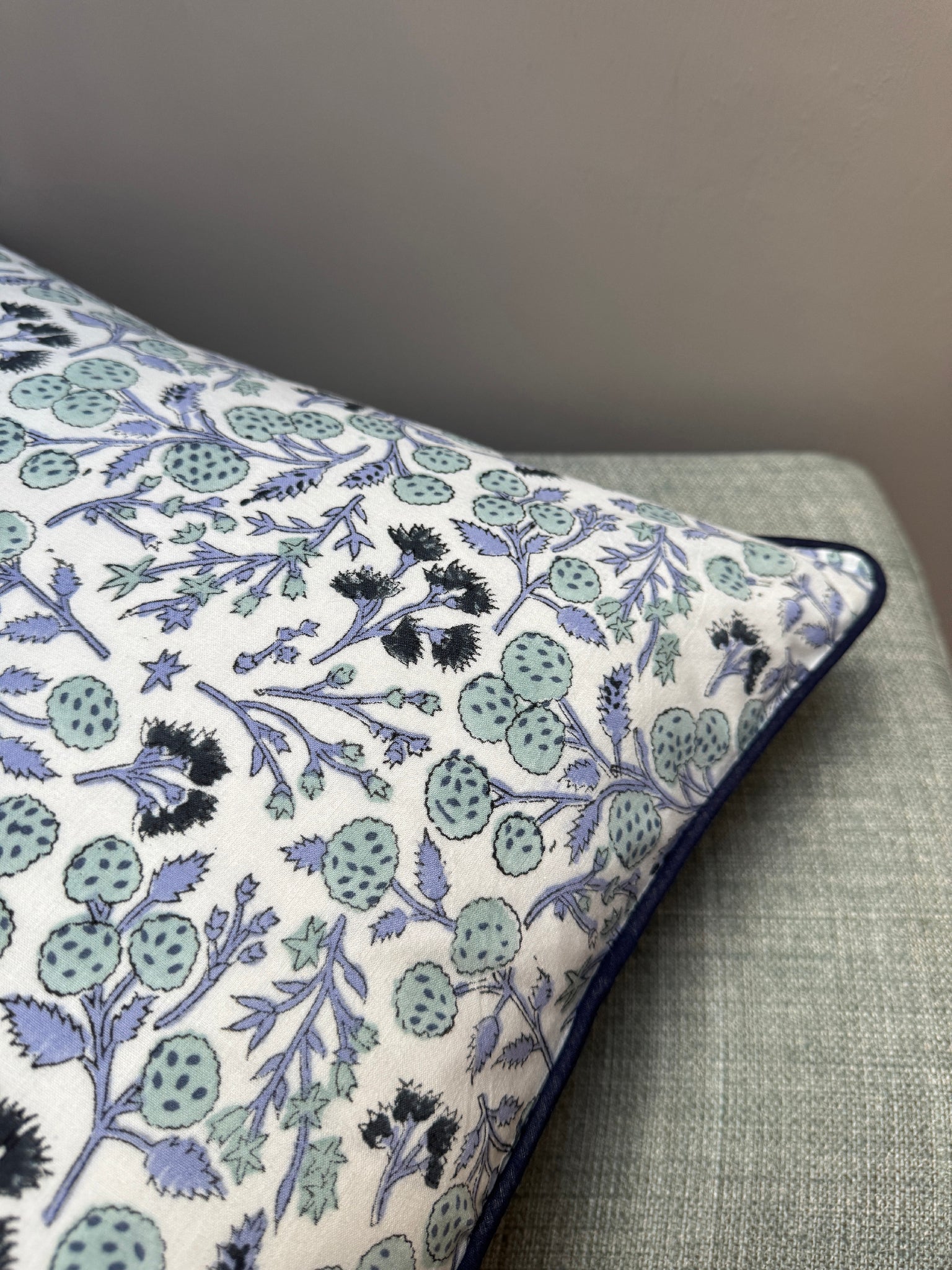 Hand blocked printed in India by marvellous craftsmen, these covers are finished with a contrasting piping for a distinctive touch.  They have an envelope opening.