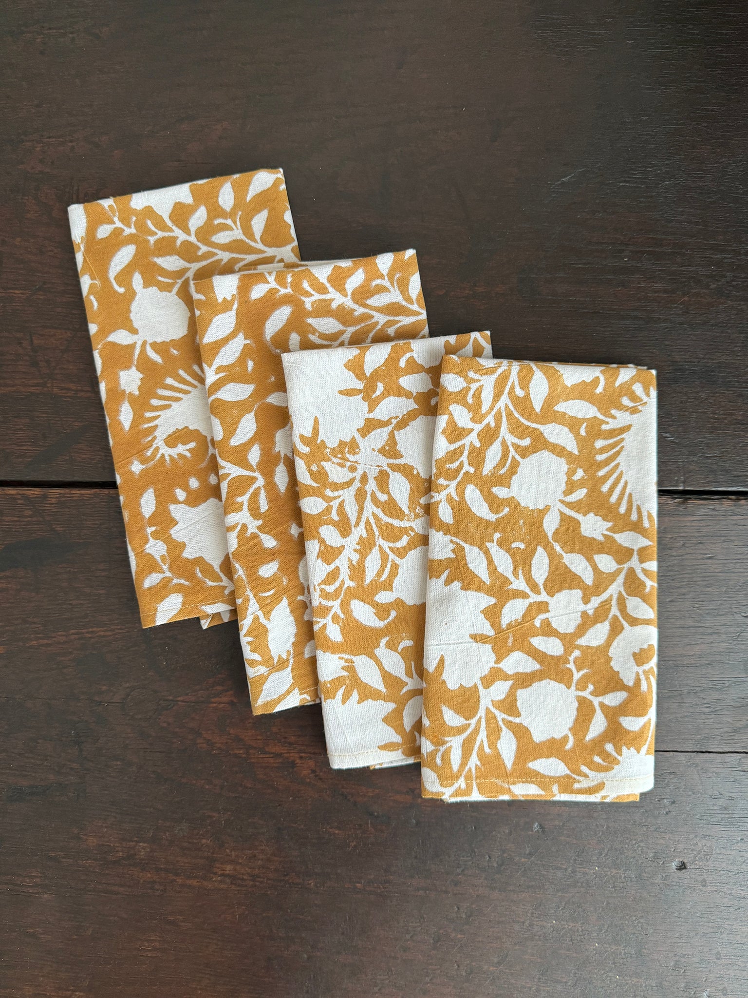 Block Printed Napkin Set of 4, Secret Garden in Ochre