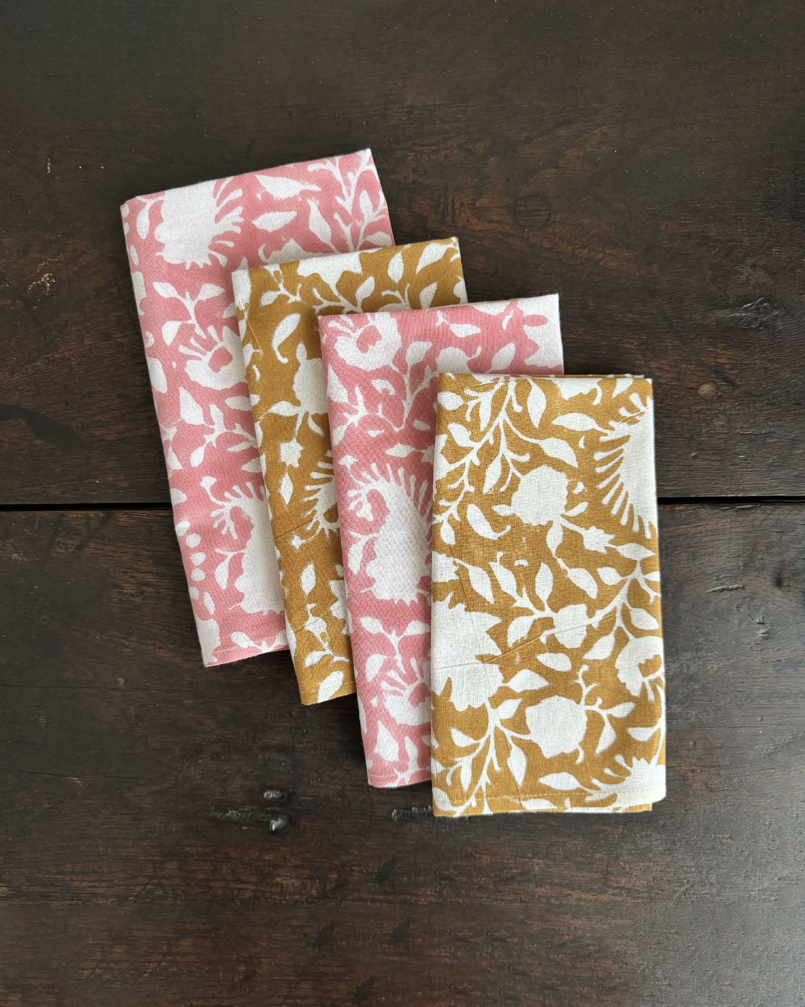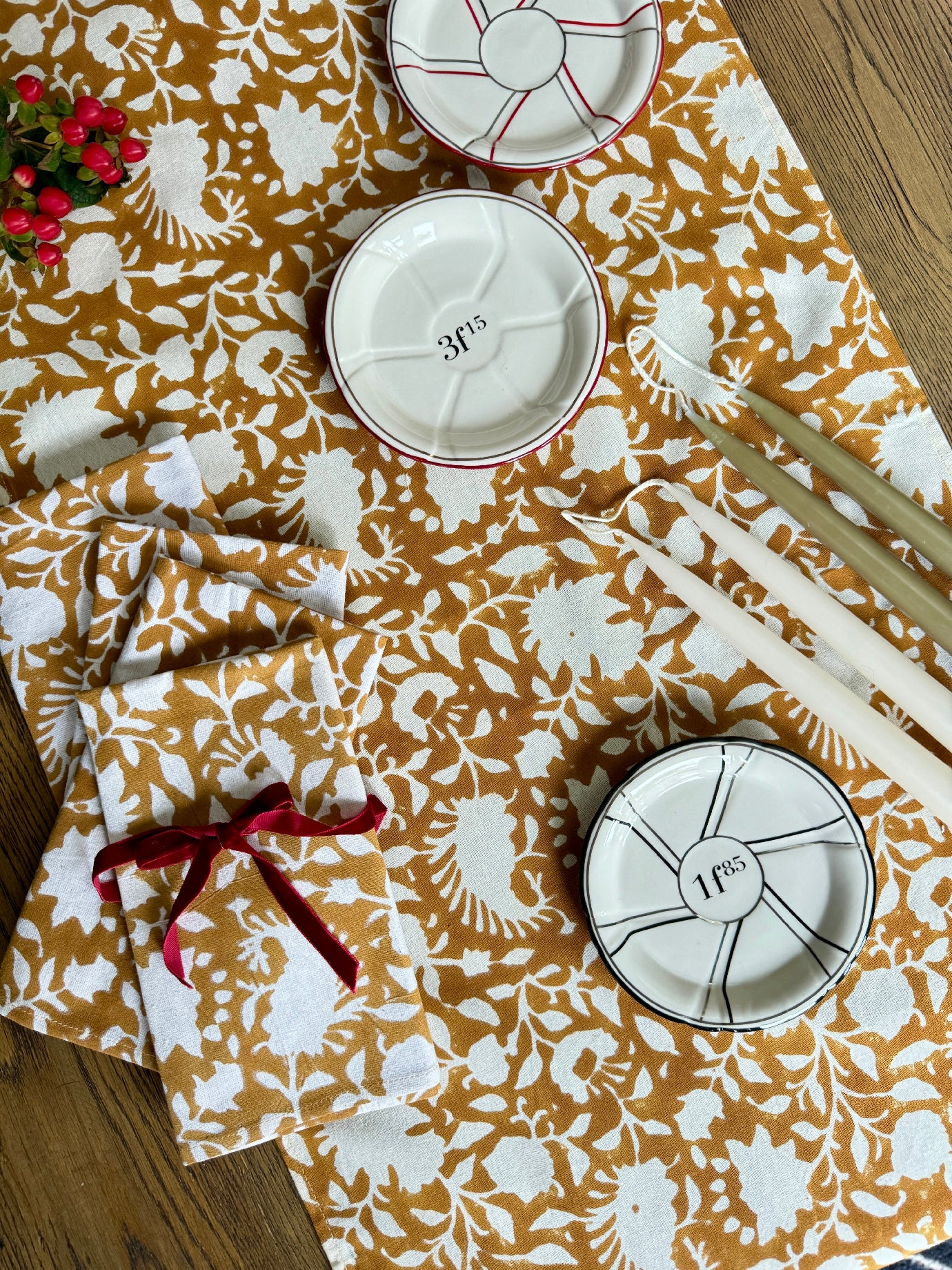 Hand block printed napkin set featuring a classic, yet modern floral design in ochre.