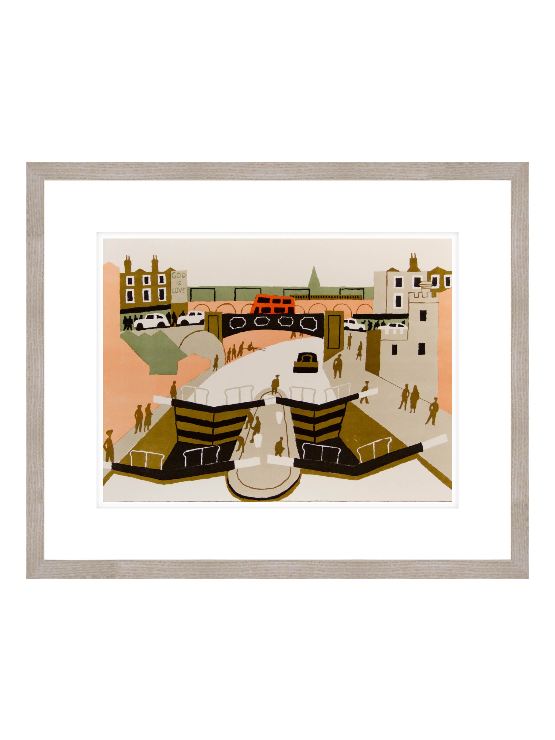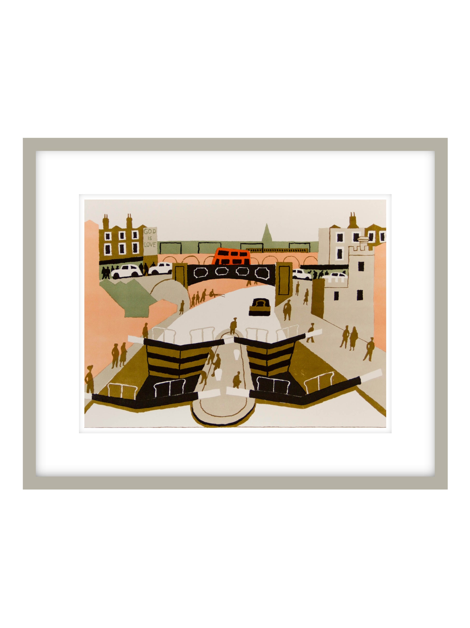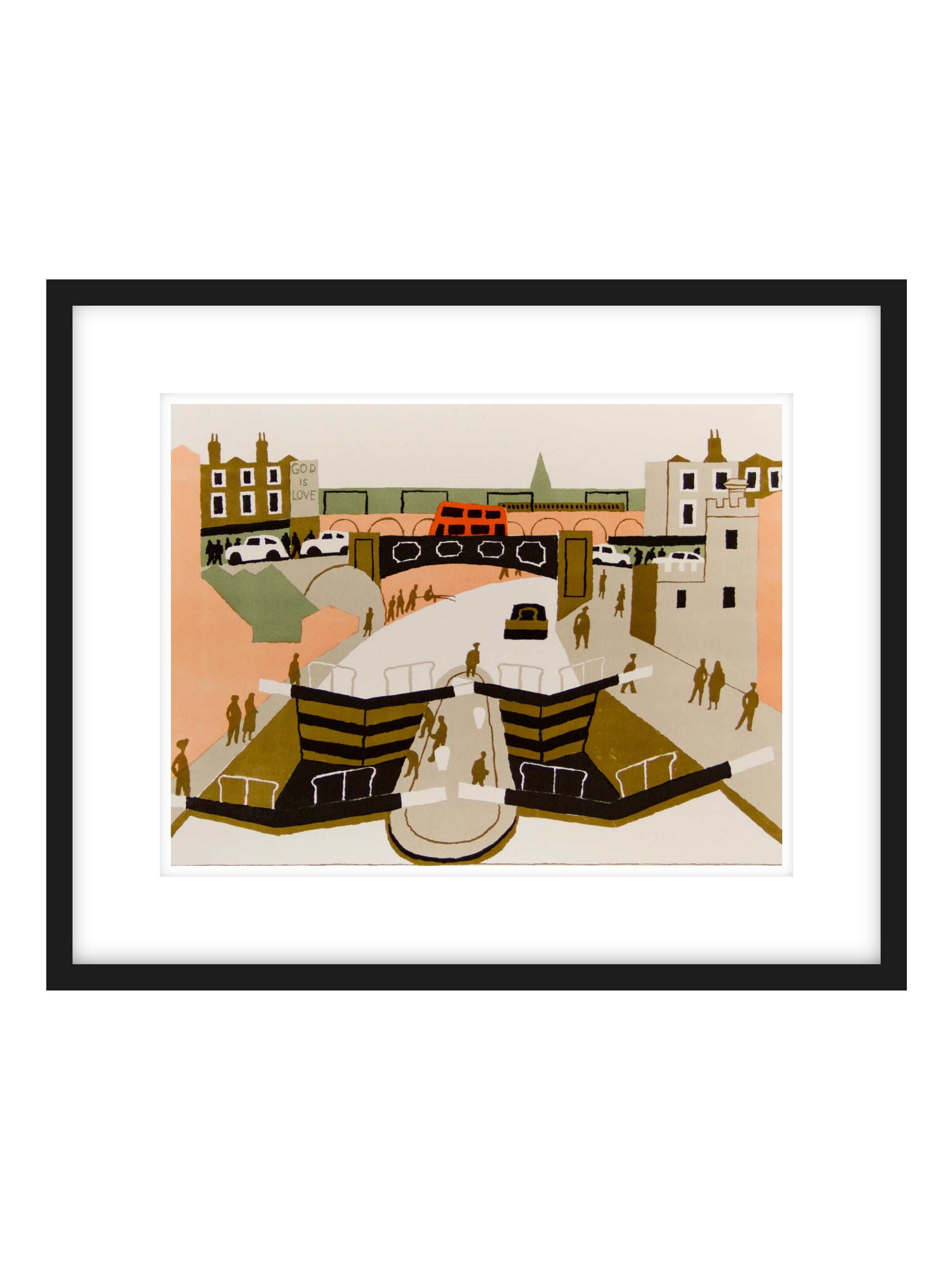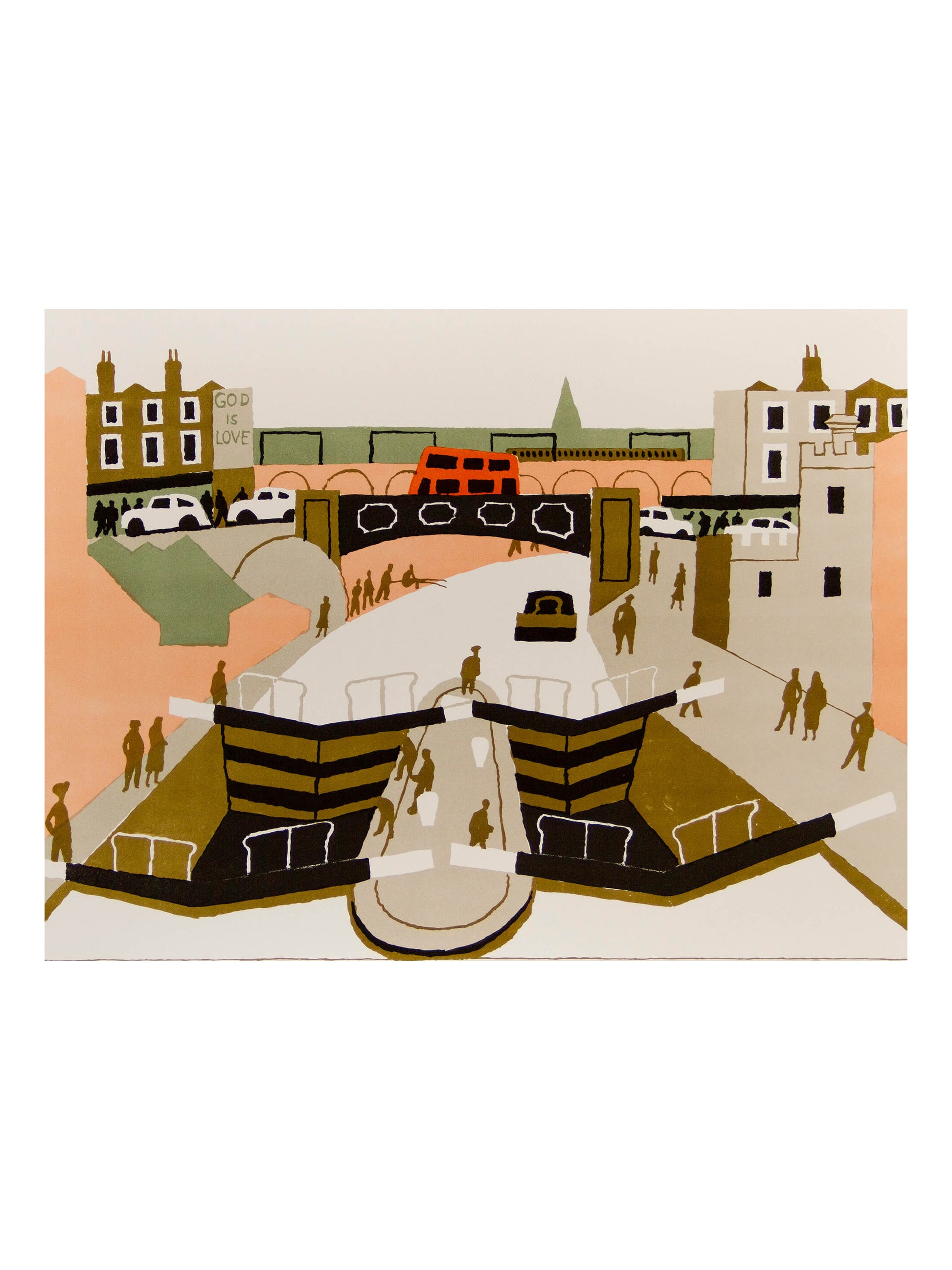 Locks are both access routes and points for ‘gongoozling’ (Linconshire canal-worker slang for those who stand and stare – gawp, we might say – although the term ‘gongoozler’ is still very much used by those know the canals). But this is also very much London: the Thames; the red double-decker bus; the fisherman and the church spire. This is a lyrical evocation of a point in time by the famous Camden Lock.