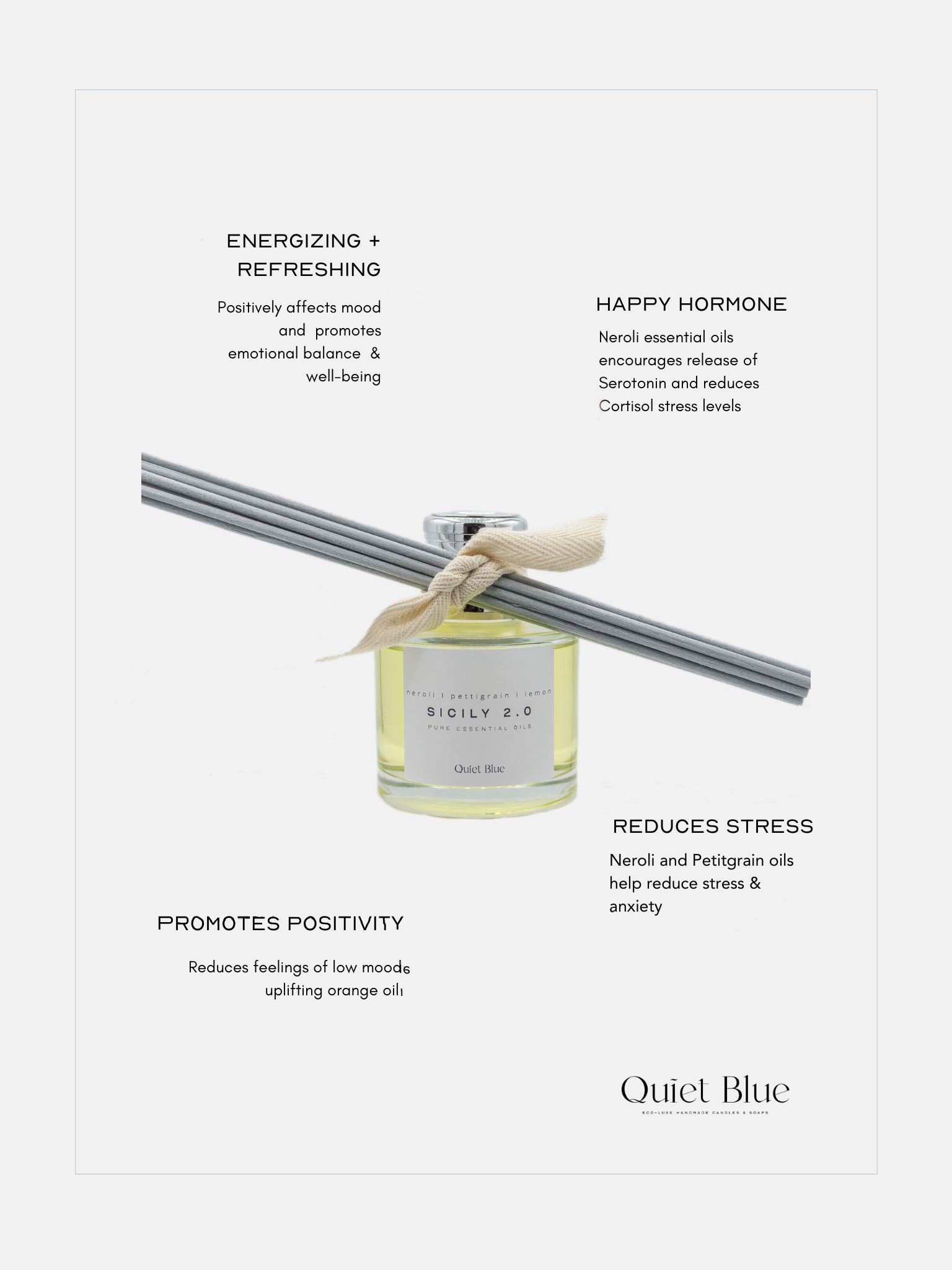 Experience a burst of energy and joy with Sicily reed diffuser.  Infused with pure essential oils of Neroli, Petitgrain and subtle citrusy lemon  and lavender notes, the scent has been specially created to bring a sense of Italian charm to your home.
