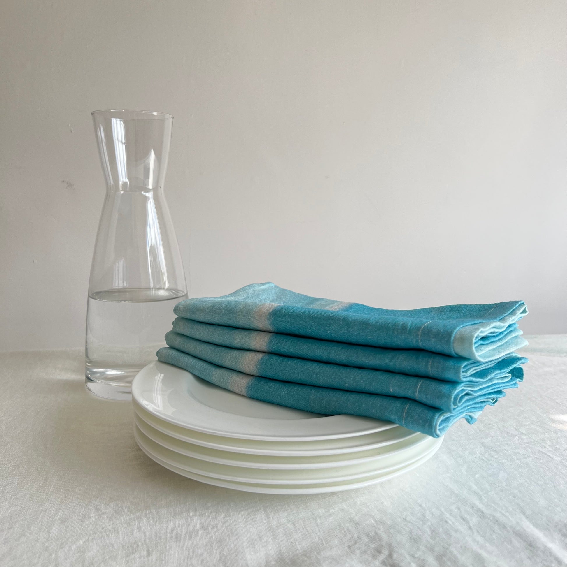 Set of four blue ombre linen napkins, inspired by the different shades of the sea, our Azzurro Napkin reminds us of warm and sunny places, where the blue sky meets the wonderful blue ocean.
