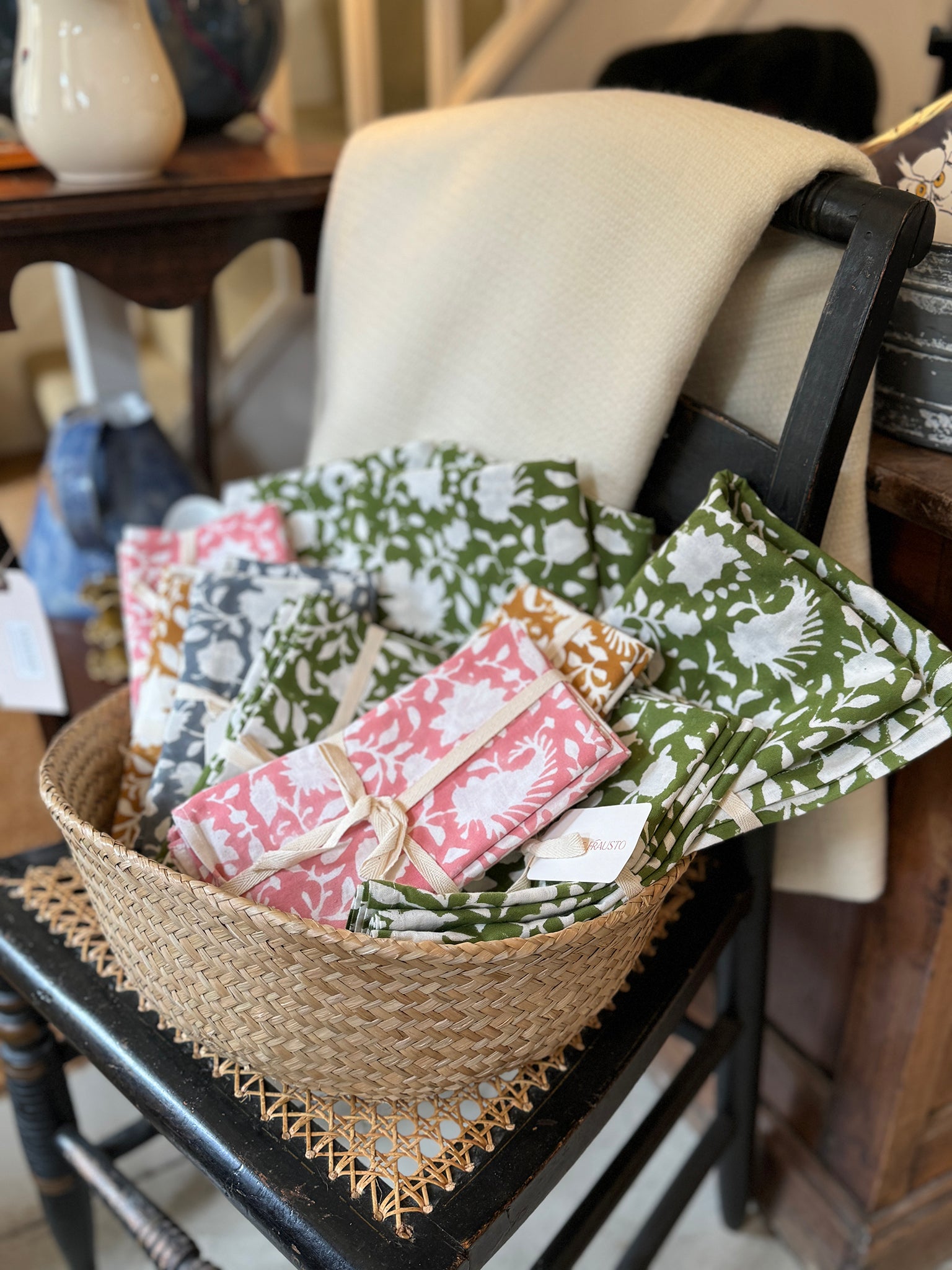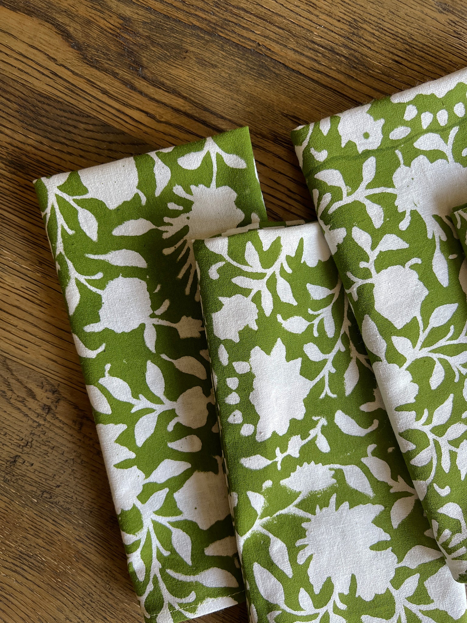 Hand block printed napkin set featuring a classic and timeless floral design in olive green. These artisan sewn cotton napkins are handcrafted in India.