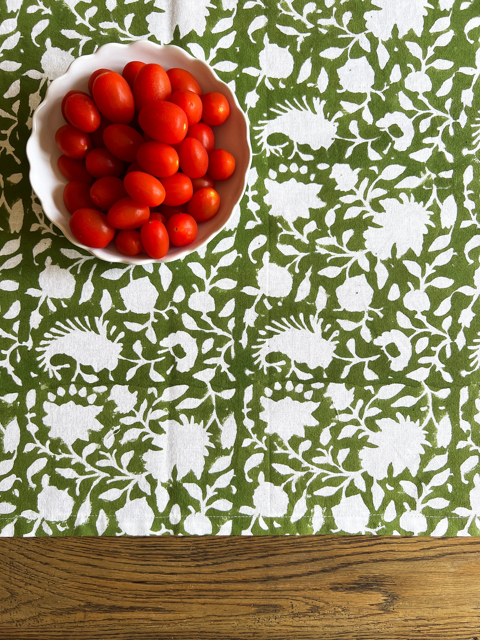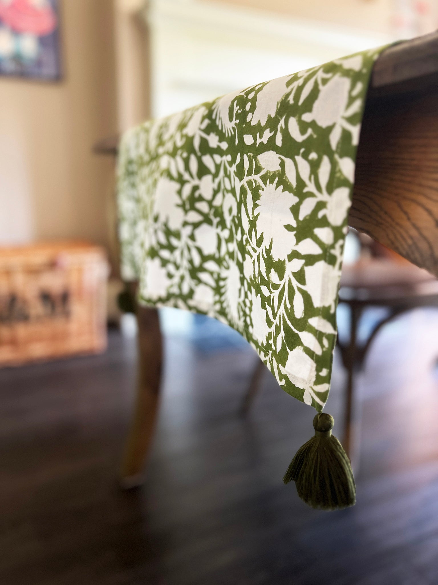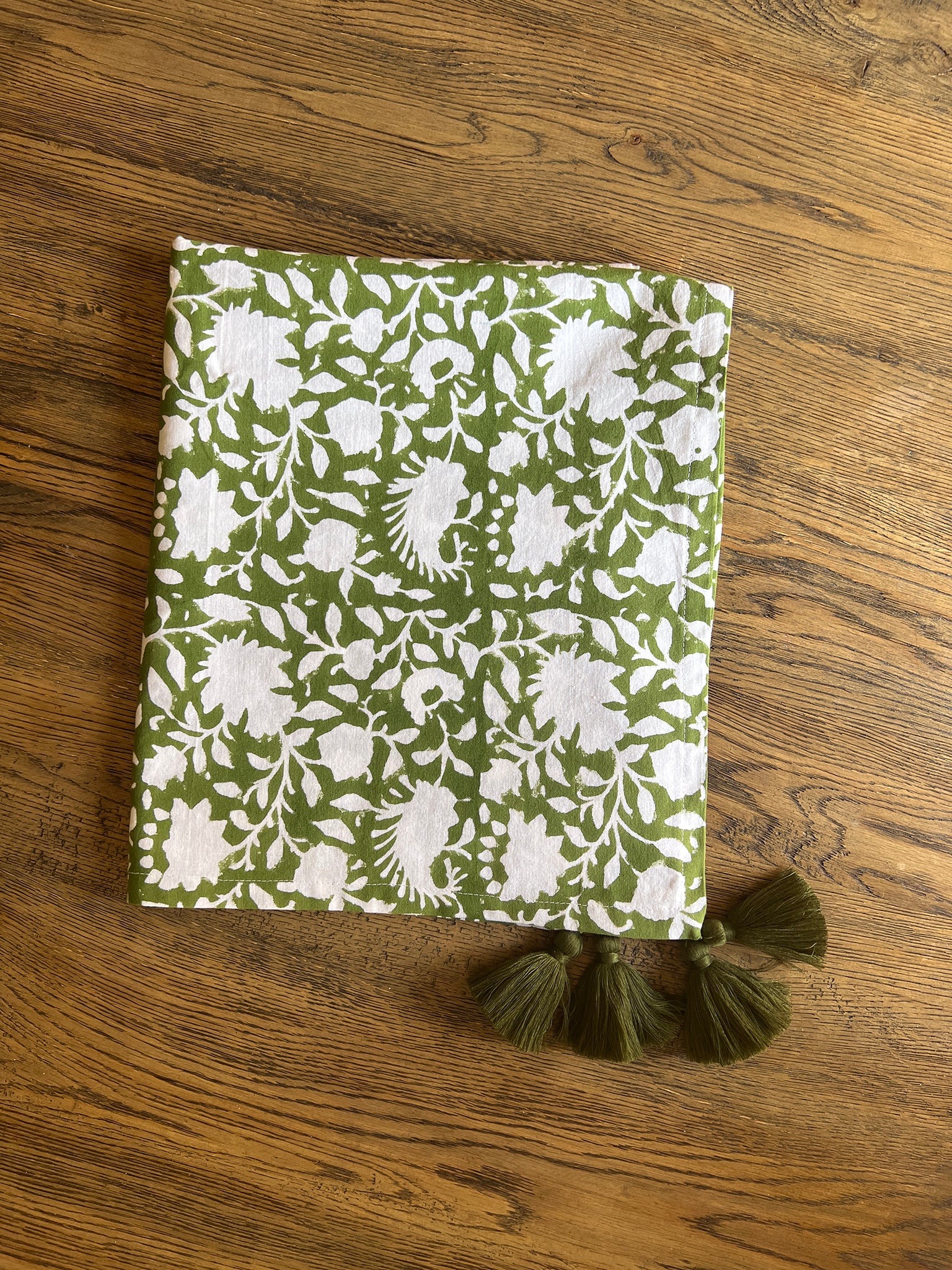 Hand block printed table runner featuring a classic floral design in olive green and green rich tassels on each corner.