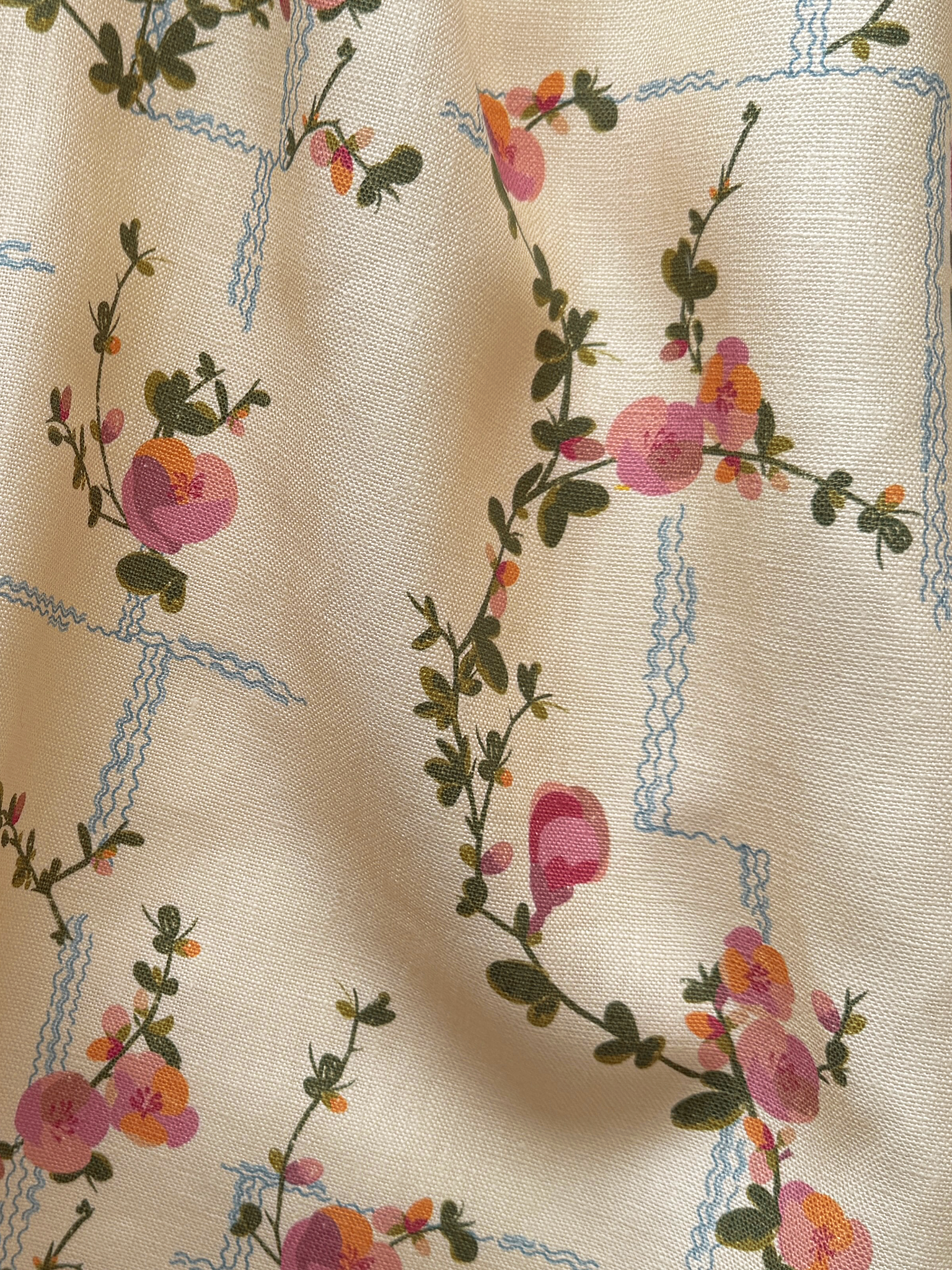 100% Heavy weight linen. Hand drawn Japanese Quince Flowers, both sweet and modern with wavy lines as a beige backdrop.