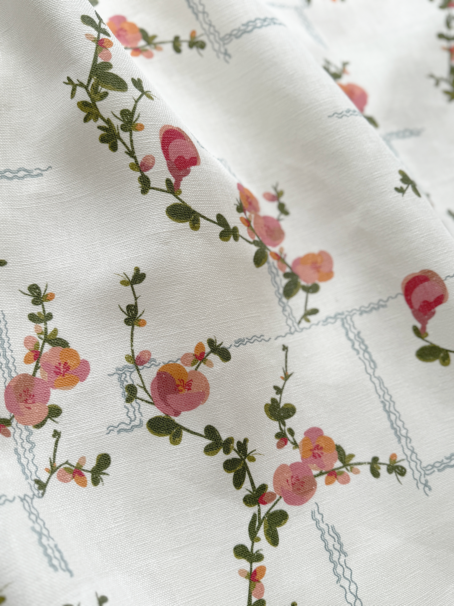 100% Heavy weight linen. Hand drawn Japanese quince flowers, both sweet and modern with wavy lines as a backdrop.