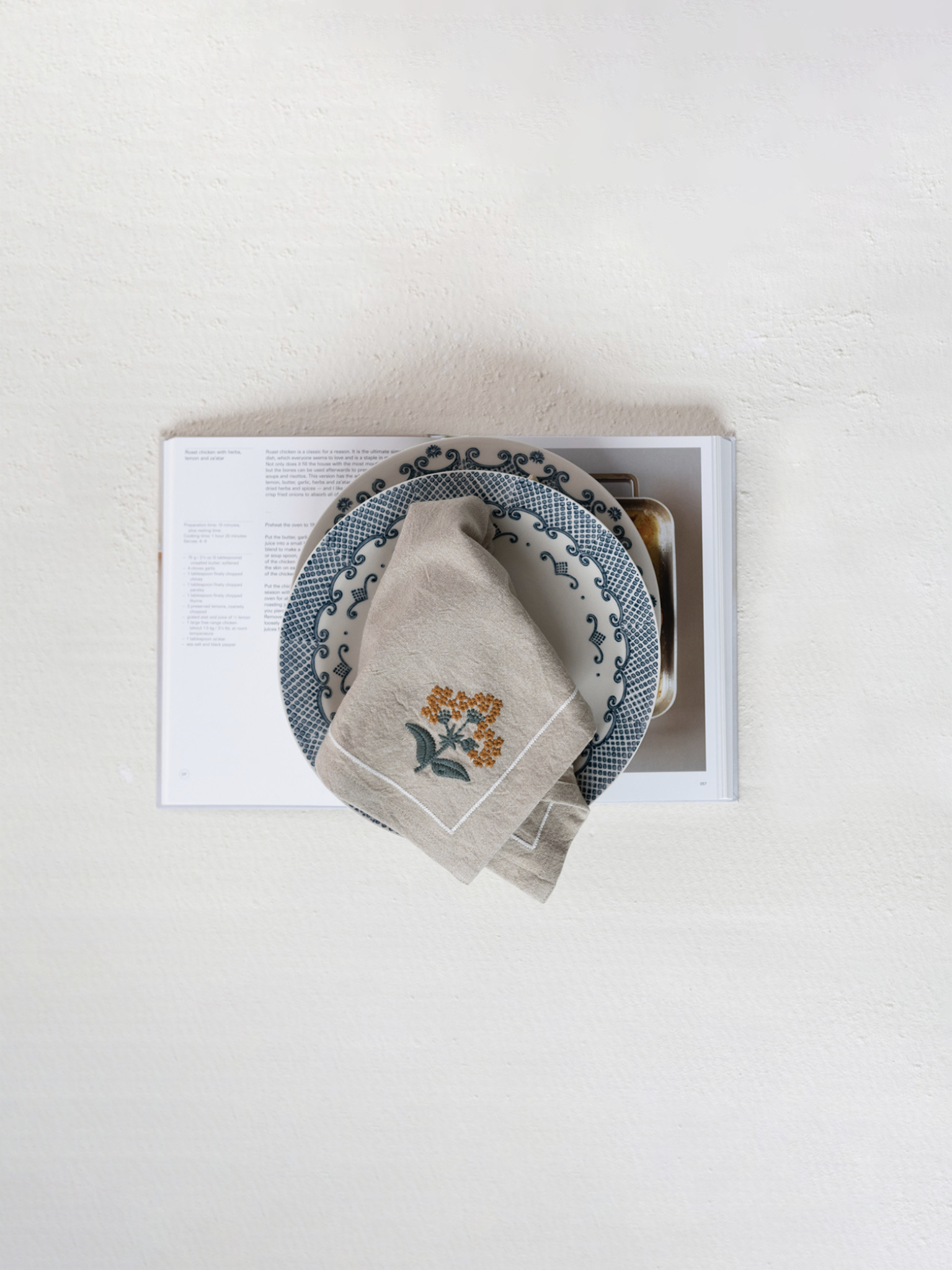 Premium soft cotton napkins finished with an embroidered detail on one cornered and a delicate single border. Truly versatile design, Mustard Flower Embroidered Napkins are ideal for every day use and look wonderful on a bare table or can be layered with the Secret Garden Table Runner.