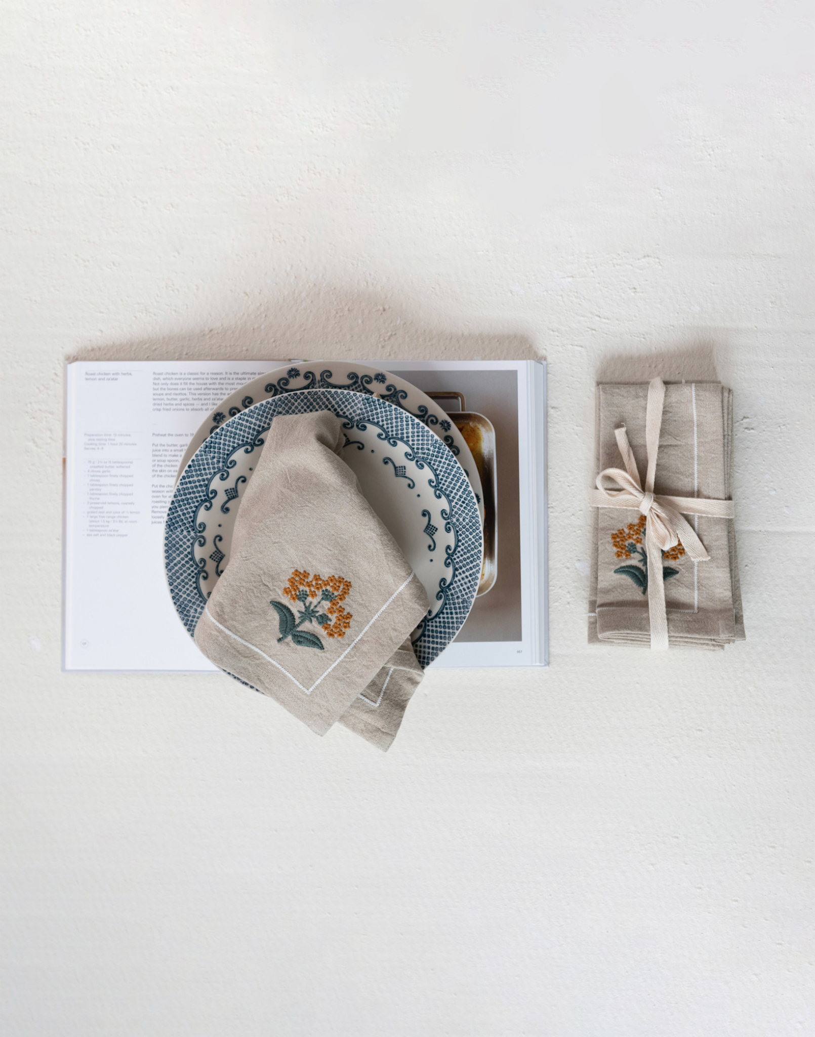 Contemporary and timeless, the new Mustard Embroidered Napkins have a soft and romantic look detailed with a delicately embroidered Mustard flower detail.