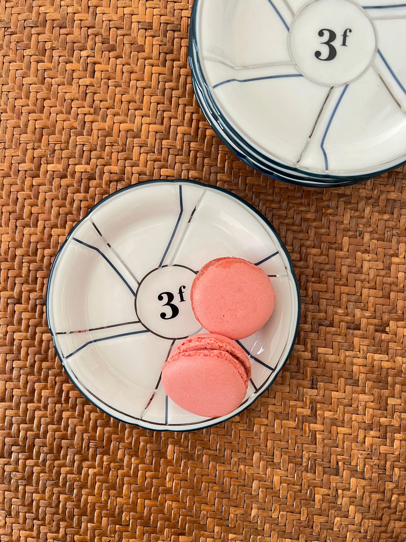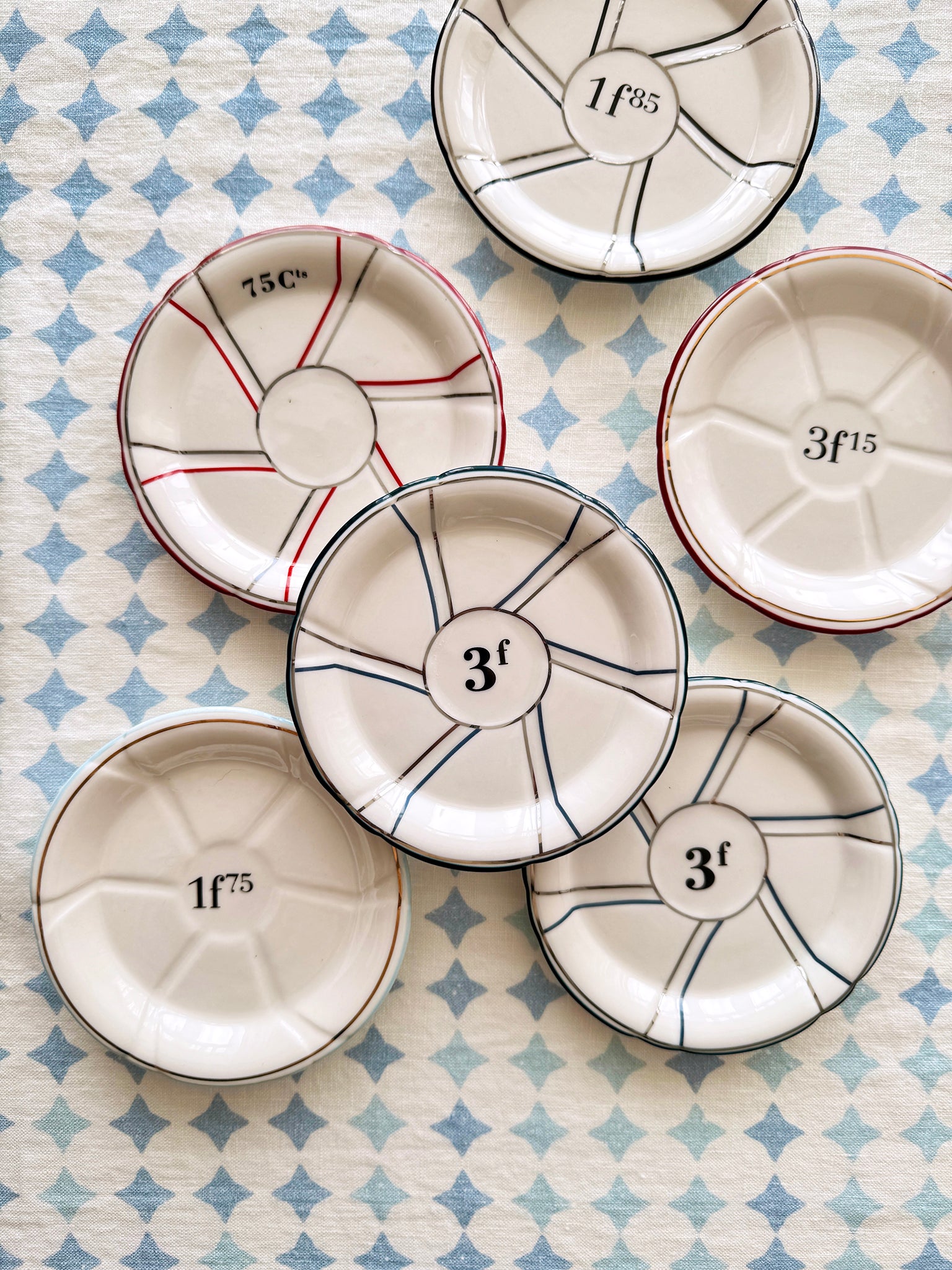 These hand painted porcelain saucers or coasters are faithful reproductions of originals once found in 19th century French bar life. Sometimes referred to as French tip trays, these saucers served a dual purpose as both a coaster and as a way to indicate the price of the drinks being served.