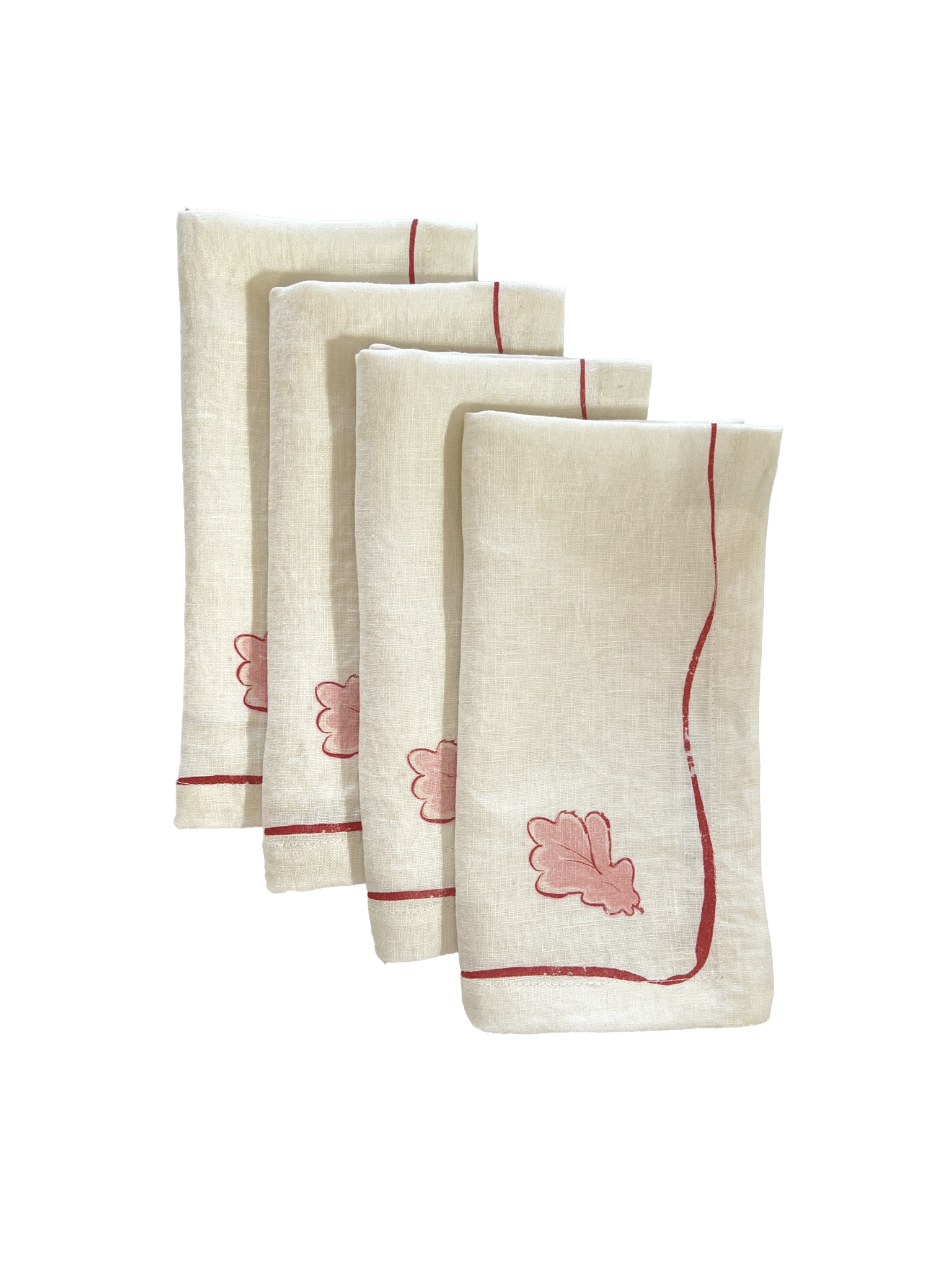 A set of four beautiful napkins, showing a single oak leaf, with its curvy and soft contour lines makes the perfect pairing for our Grace tablecloth.