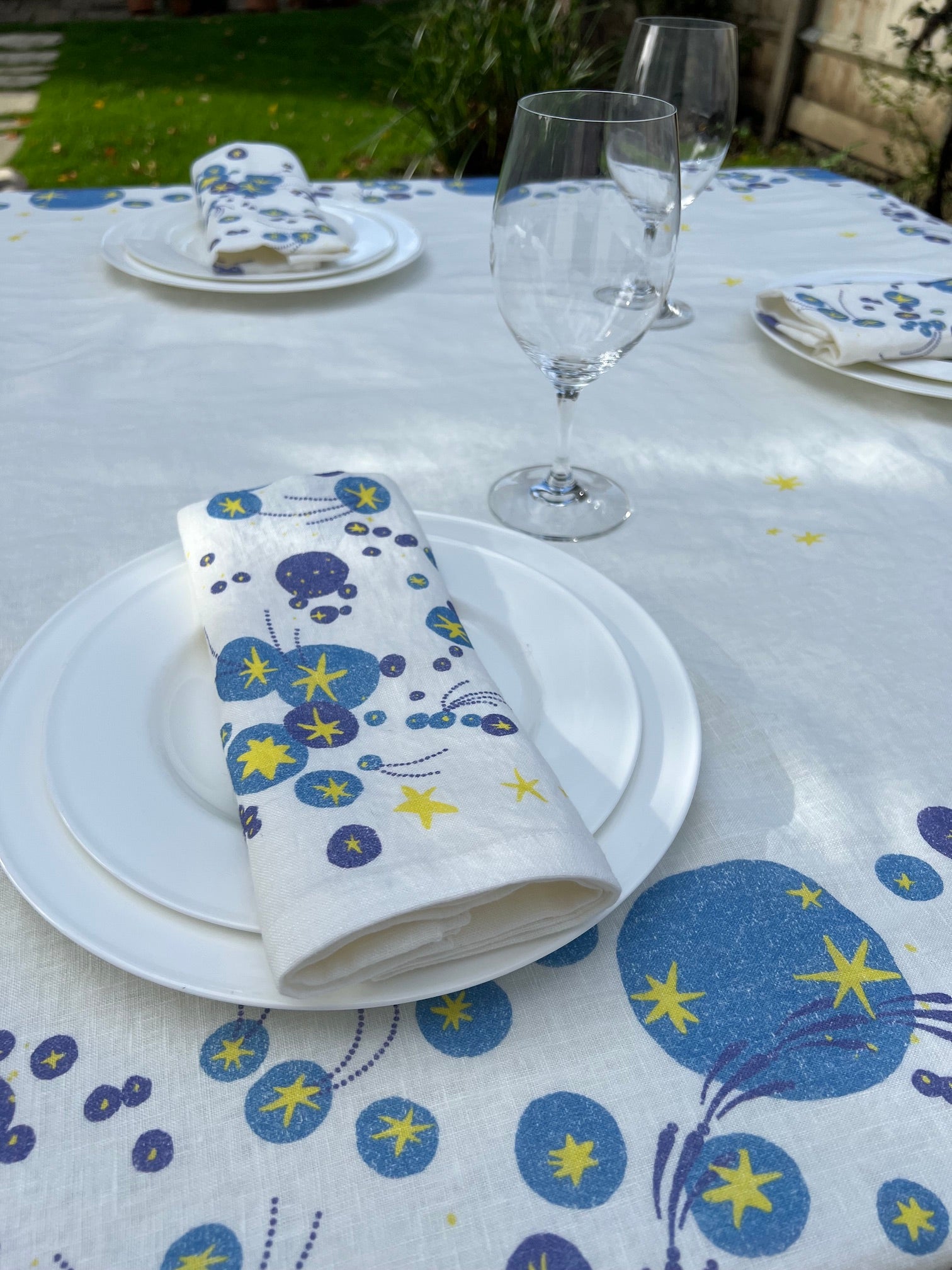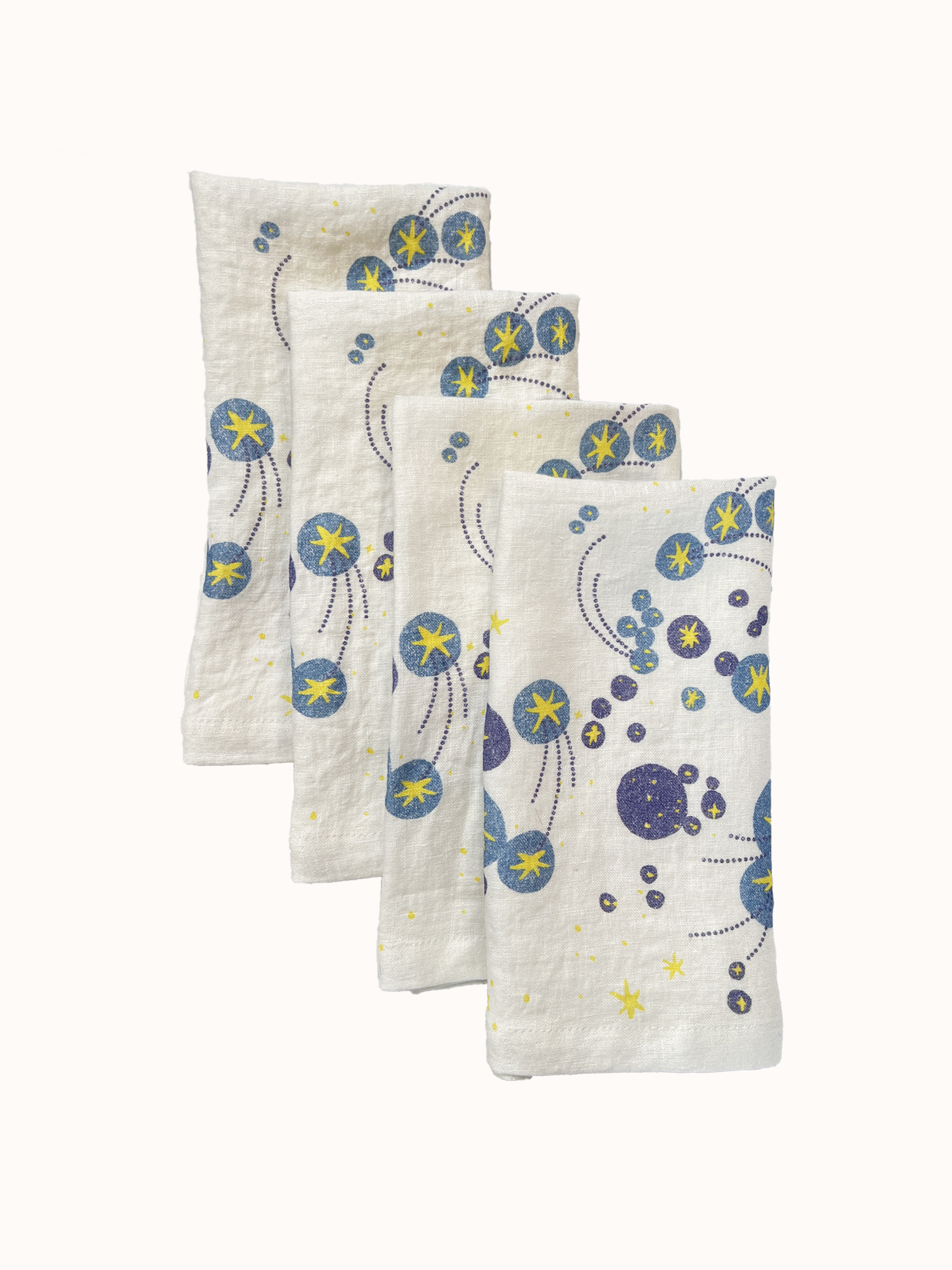 Set of four napkins with a brilliant design. A starburst galaxy and shooting stars waiting to be wished upon. Printed on pure linen, these napkins add a layer of bursting brilliance and joy to any table. A perfect gift to yourself or your host/hostess.