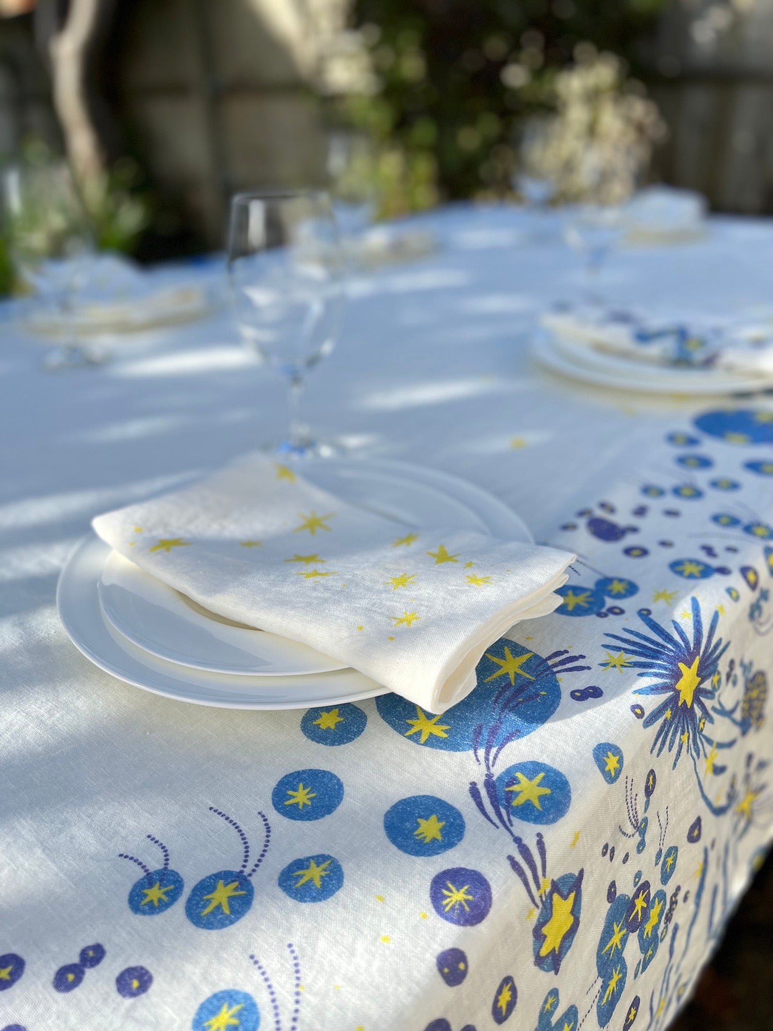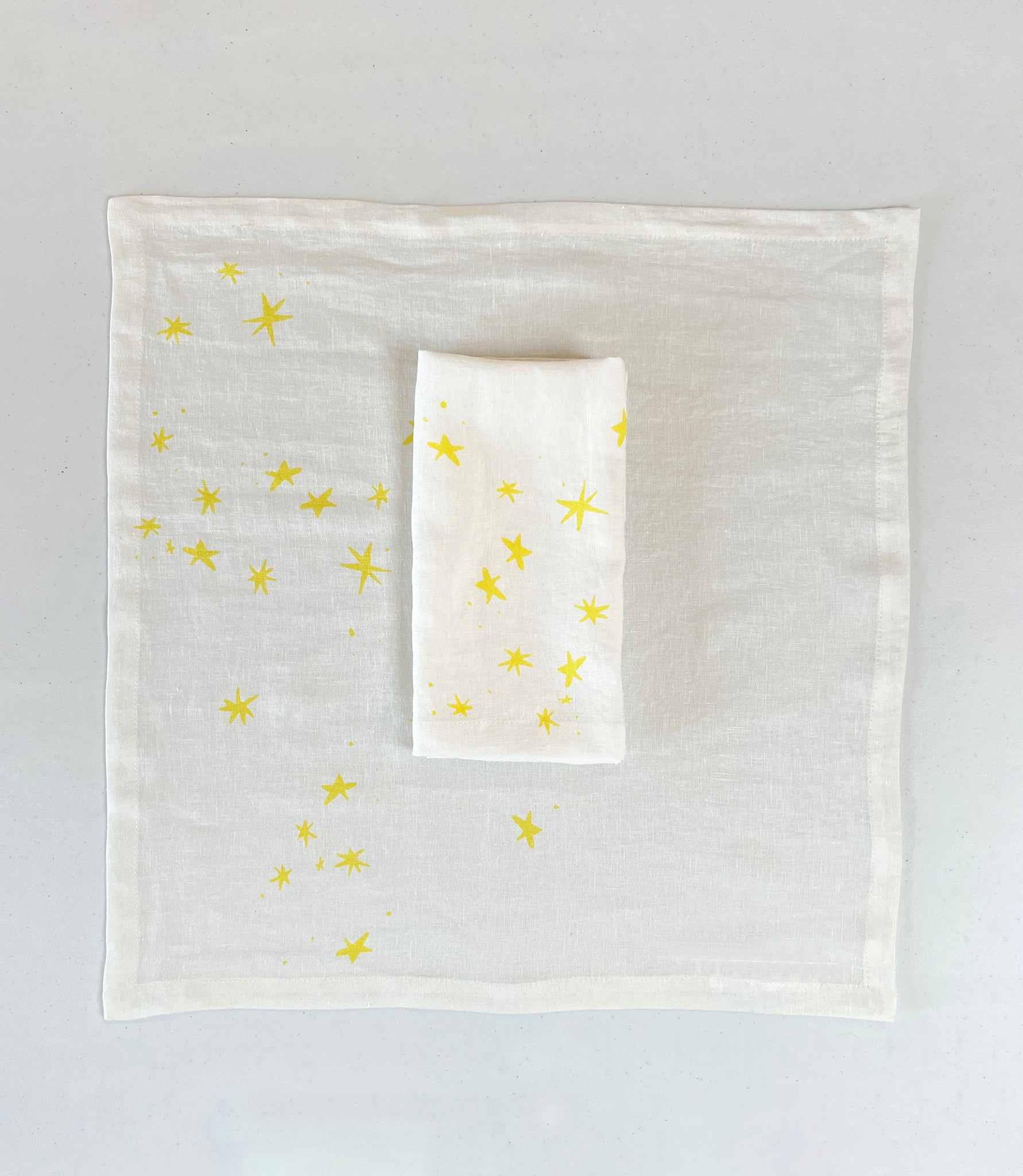Set of 4 stunning napkins. The simple and quiet joy of shining stars against an open clear sky. Printed on pure linen, these napkins add a simple layer of radiance, and unequivocal joy to any table. A perfect gift to yourself or any host/hostess.