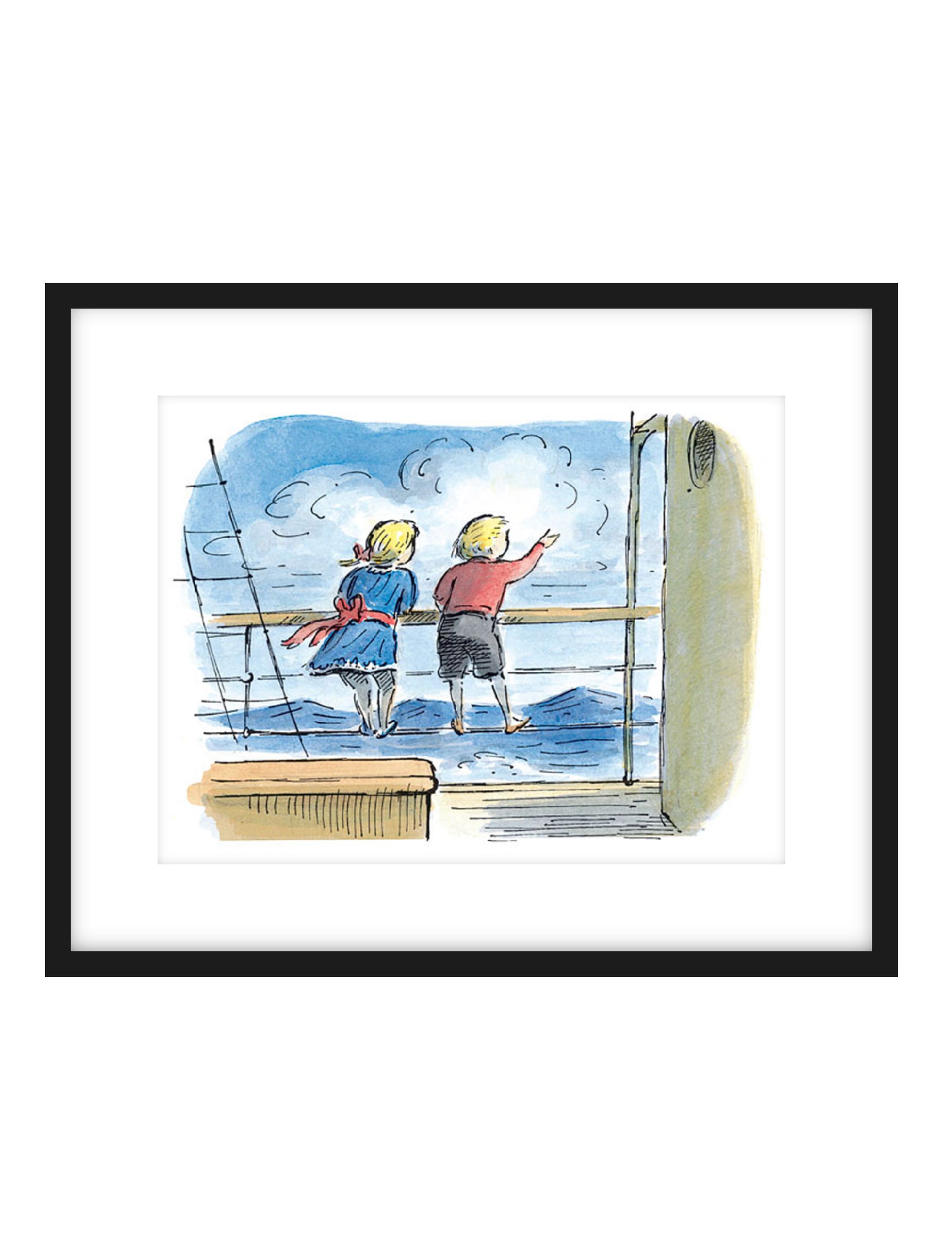 The print depicts Tim and Lucy balanced on the yacht’s railing with Tim waving out to sea.