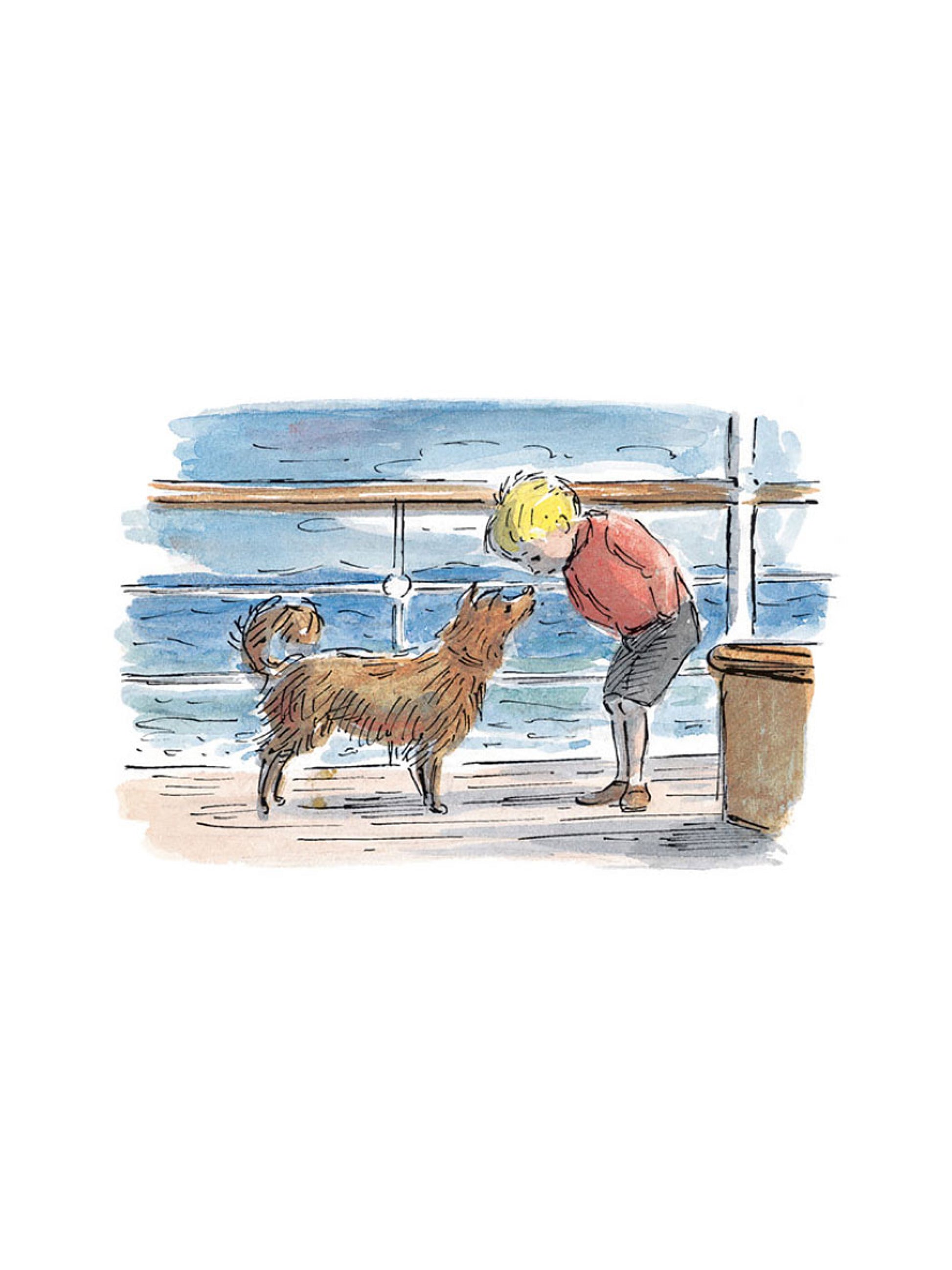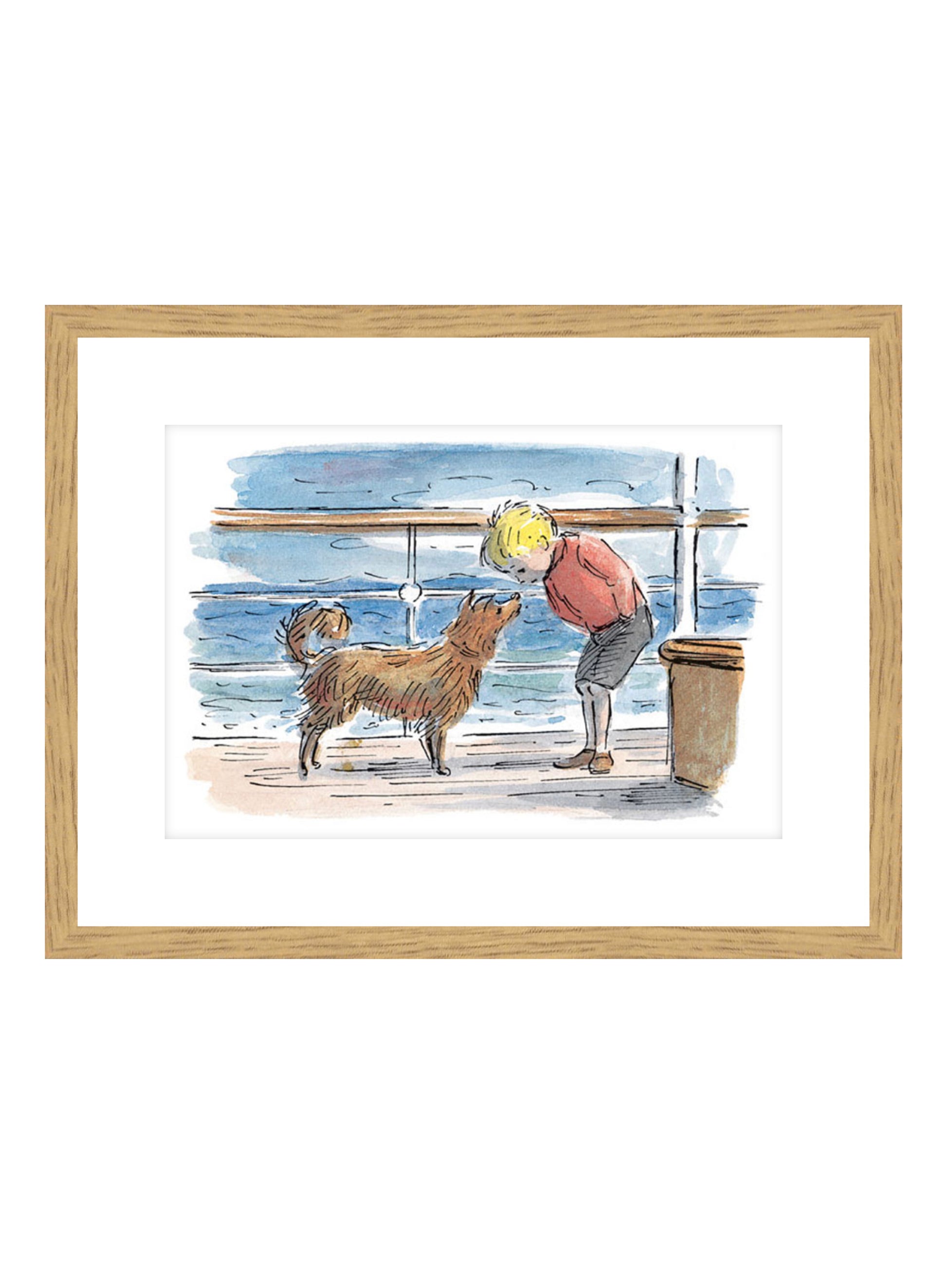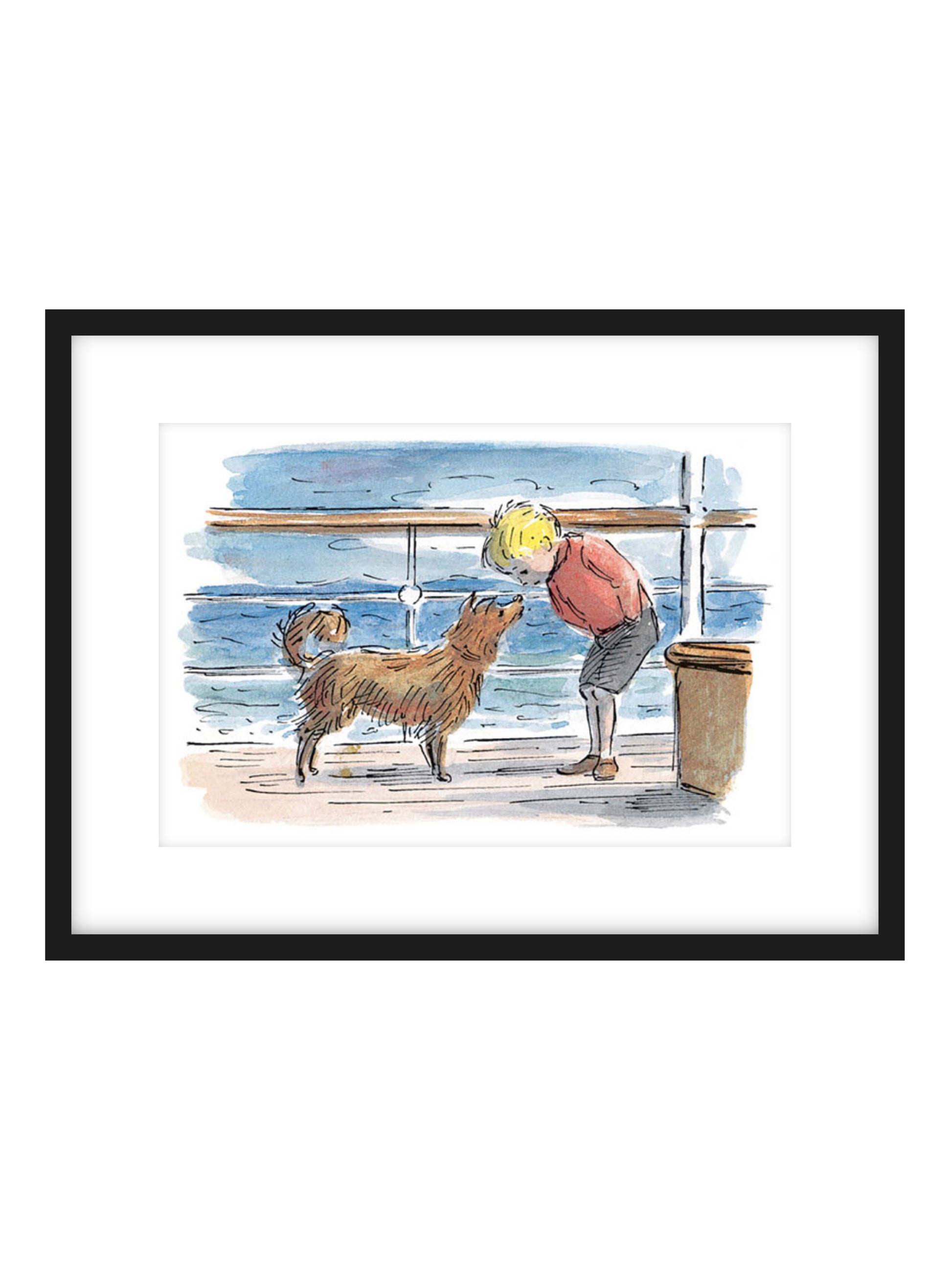 The print depicts Tim and Towser nose to nose. Towser has slipped his lead and is on the poop deck.